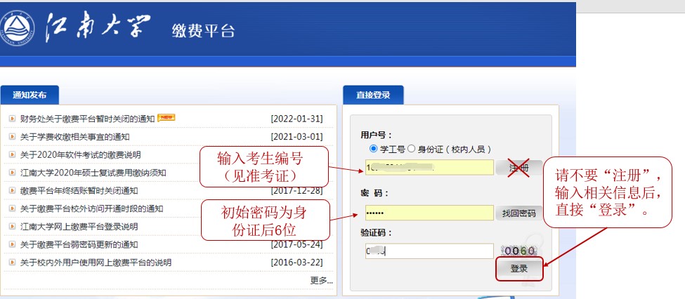 登录用户名为准考证上的考生编号(请考生下载准考证查看,准考证打印系统网址://yzgmis.pixivtop.com/zsgl/bswb/login.aspx),初始密码为身份证号码后6位。如不能正常显示收费项目,建议更换为360浏览器兼容模式。