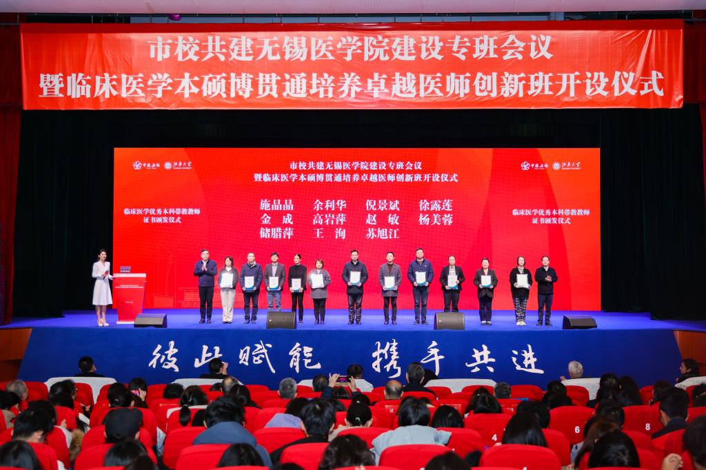 无锡市政府副市长秦咏薪为临床医学专业学位博士研究生指导教师颁发聘书,无锡市发展和改革委员会党组书记、主任曹文彬为优秀硕士研究生指导教师颁发证书,无锡市教育局局长宋新春和无锡市卫生健康委员会党委书记、主任笪学荣为临床医学优秀本科带教教师颁发证书。