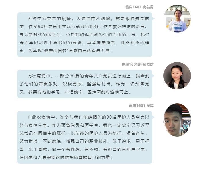 还有20多名学生党员提笔抒发自己心中的感慨。他们认为,身为“90后”的医学生党员,习近平总书记的回信给予了大家很大的鼓励,将激励大家继续坚守入党时的初衷和誓言,践行“健康所系,性命相托”的医学生誓言。未来,大家会努力提高专业水平,精进操作能力,将自己的所学用在人民需要的地方,用在国家需要的地方。作为“90后”的一代,会用实际行动来证明新时代青年人的家国情怀与责任担当。