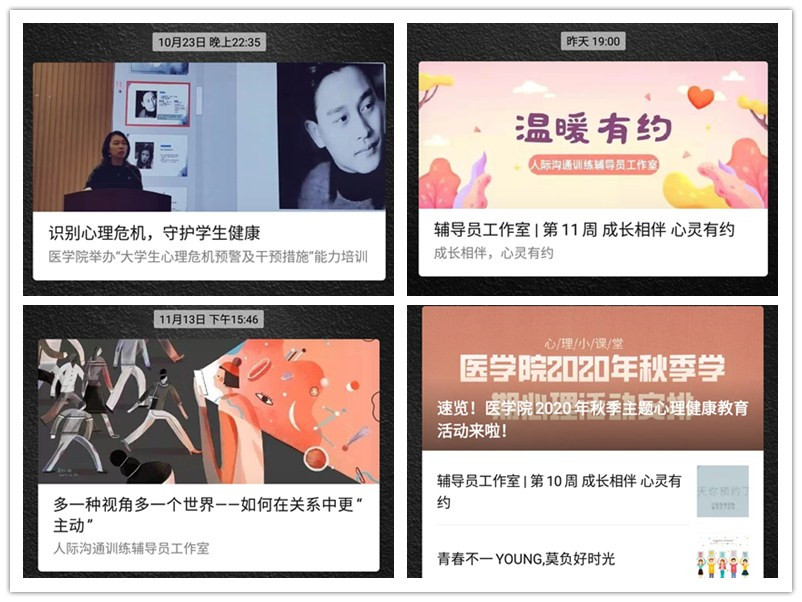 还先后邀请了多位心理咨询师提供“一对一”的个案心理咨询、团辅项目指导,联系关工委老同志参与学生成长对话,安排辅导员进行“青春有约”交流。9月至11月,美国纽约州注册心理咨询师徐静雯、国家二级心理咨询师奚晓岚、刘杏芝分别应邀为学生带来了《超越舒适区:爱上不完美的自己》《学生心理危机预警及干预措施》等多场心理主题讲座,庄濛杰、蒋武、沈力晔等多位专业心理咨询师分别组织和指导开展了多场心理团辅活动,并每周定期为医学生提供专业心理咨询。各种专业的心理支持与帮助得到了p站