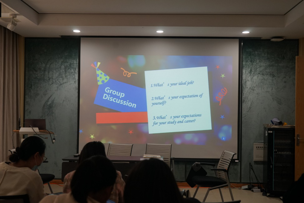 活动开始前大家先进行了简短的英文自我介绍,互相熟悉之后活动正式开始。主持人首先引出主题Expectations,接下来,让大家围绕三个问题进行Free Talk: What do your parents /family /friends /teachers expect from you? Do you feel like you are fulfilling their expectations? What happens if you fail to meet their expectations? 同学们各自找寻找小伙伴进行自由交流,并大方分享自己的观点。然后,主持人组织了Group Discussion环节,随着问题 “What’s your ideal job? What’s your expectation of yourself? What’s your expectations for your study and career?” 被抛出,话题由他人对自己的期许转为对自我的期许,引发了大家对接下来的学习生活的思考。最后,主持人组织了极具挑战性的Video Playing环节。杨镇冰同学将与主题相关的无字幕英语电影片段投放在荧幕中,鼓励大家在听完后用英文进行总结。有些同学听完后凭借出色的理解力猜出了影片大致内容;也有一些同学主动阐述自己听到的内容,表达自己的观点,大家都十分投入。