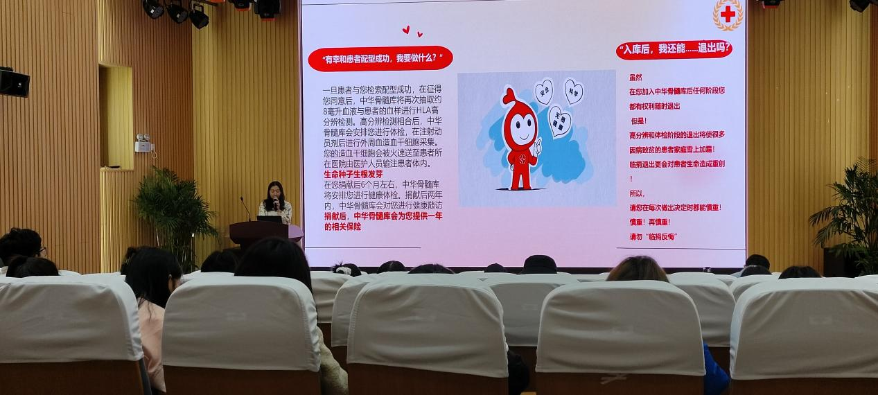 星火计划志愿服务团队在校内成功举办了主题为“与爱同行,生命相‘髓’”的科普宣讲活动,讲座旨在向大学生们宣传、普及造血干细胞捐献的相关知识,提高其对“三献”的科学认识及生命健康意识。
