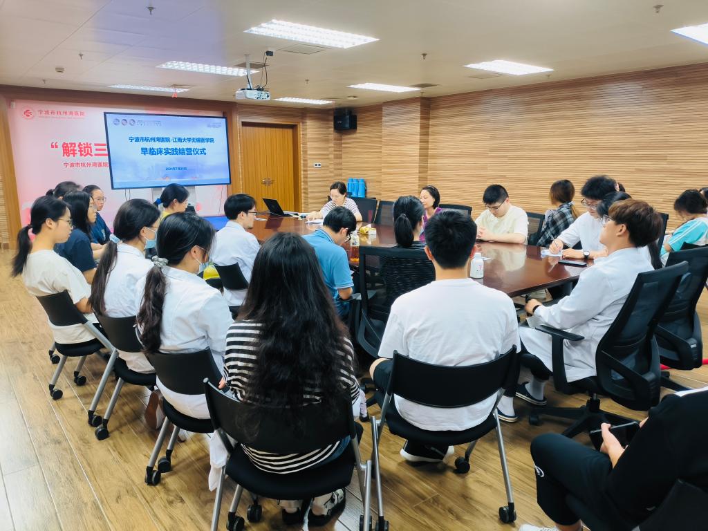 附属仁济医院宁波医院提供的宝贵见习机会,细致梳理了临床实践内容,并结合个人成长经验畅谈心得感悟;与会各科室带教老师与同学们展开学习交流,真情流露师生共处的幸福点滴;党办副主任周佳宣布结营,并寄望优化早临床见习机制,持续深化育人内容,共同培养高水平区域医学人才。