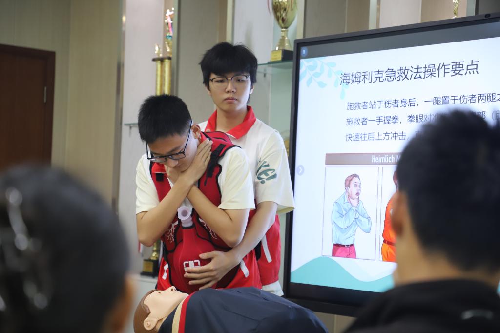 志愿者演示海姆立克急救法