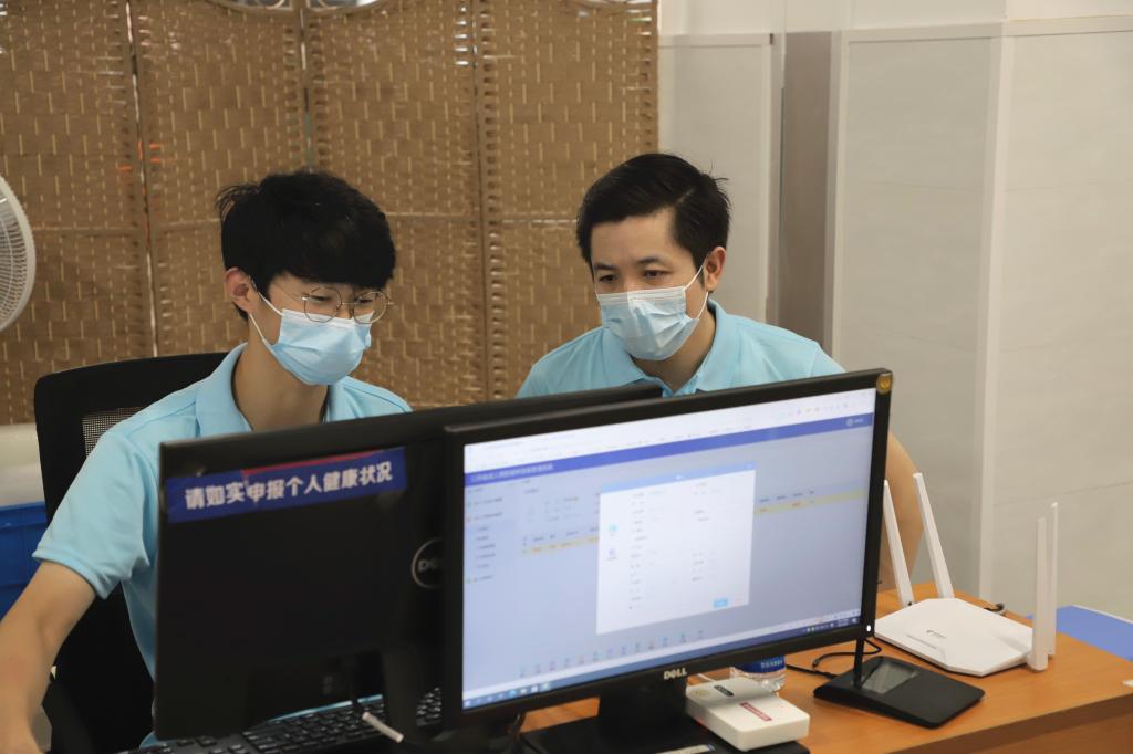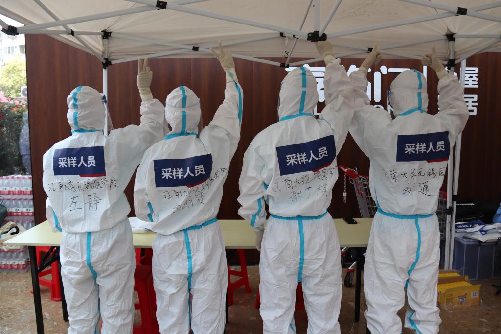 的志愿者们脱下防疫“盔甲”,无菌帽已被汗水完全浸湿,双手已被汗水浸泡到发白。维持现场秩序的志愿者们耐心细致地为前来参加核酸采样的居民提供讲解、引导、申请预制码等服务。