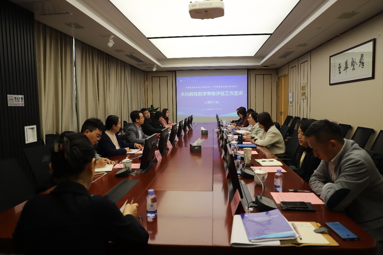 审核评估工作方案及工作进展,从文件依据、工作思路、工作进展、核心指标梳理情况和工作基础等方面进行了介绍。根据学校本科教育教学评估工作的统一部署,学院成立了以院长、书记为组长的工作领导小组,并组建了工作办公室,以及材料组、教学条件建设组、学风建设组和督察组等四个专项工作小组。学院将结合临床医学专业认证相关工作,突出医学本科教育教学特色和优势,高质量完成本科教育教学审核评估各项工作。