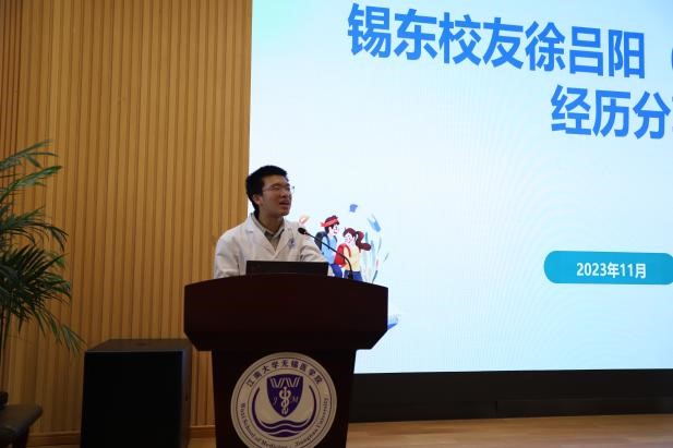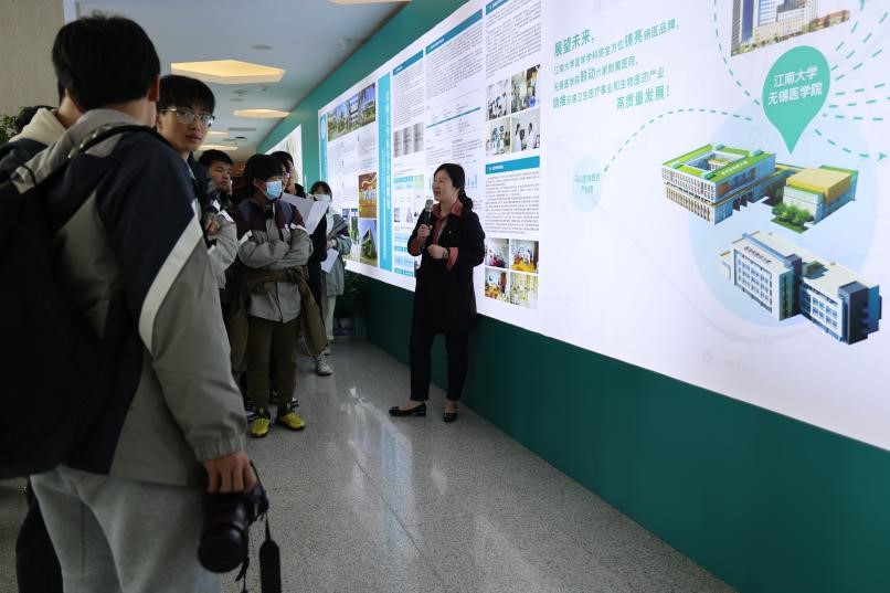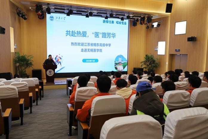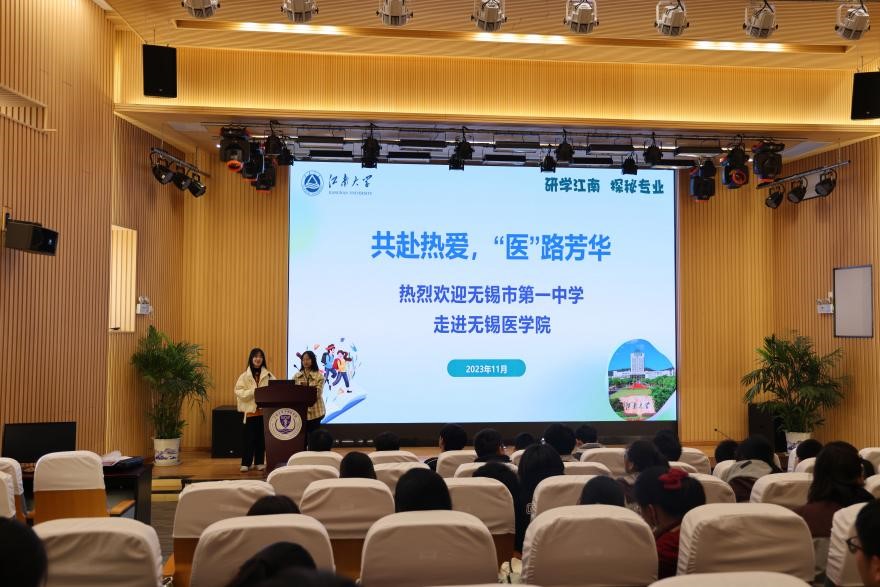 朋辈分享环节,临床医学专业2023级本科生、锡东校友徐吕阳,无锡一中校友尤宁婧、王菀宁与来访师生分享了自己的江南医学生活,展现了江南医学生积极进取、拼搏向上的精神风貌。
