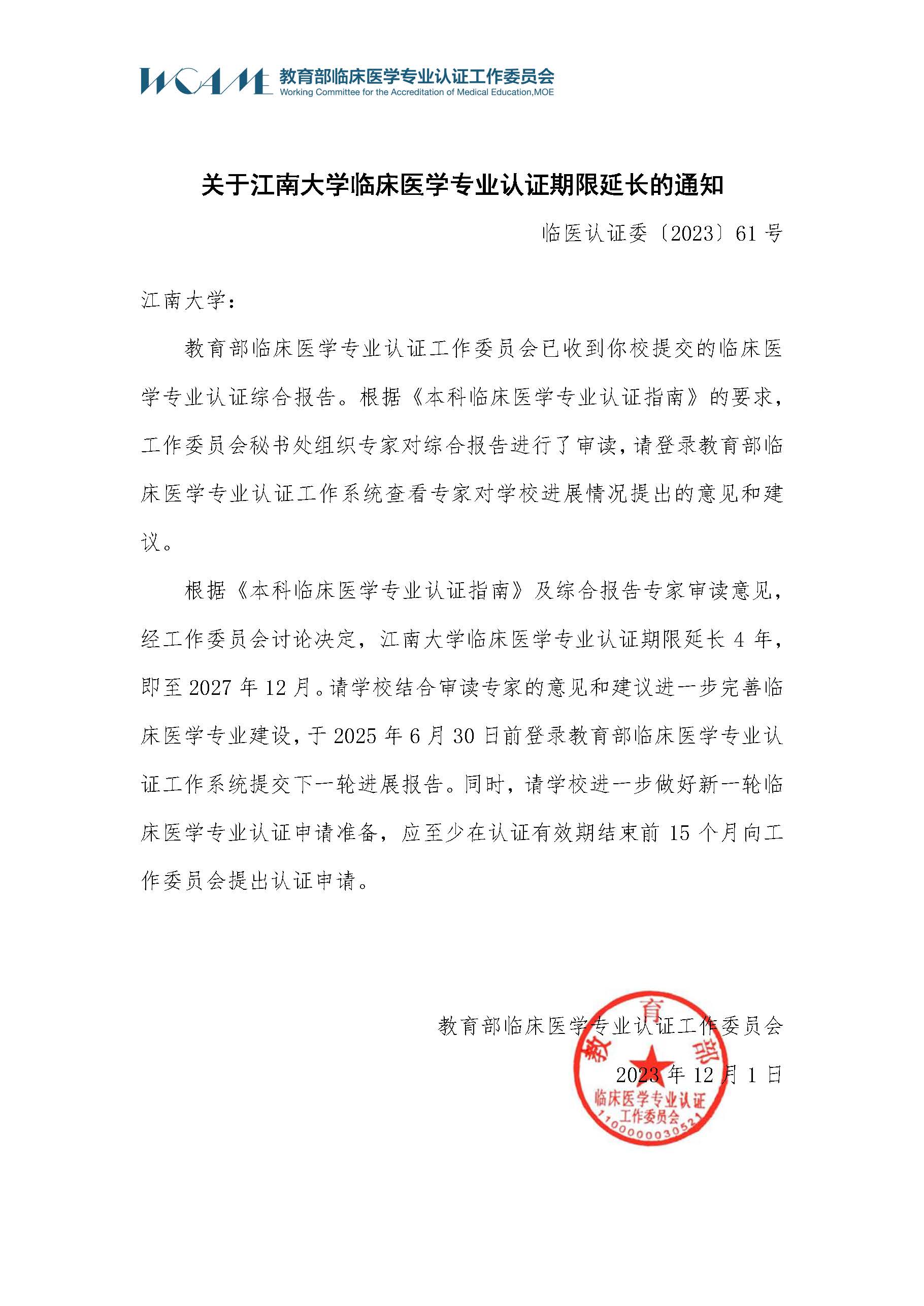 临床医学专业认证期限延长的通知》,明确我校临床医学专业认证期限延长4年,总期限达8年,即至2027年12月。