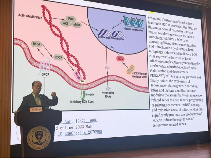 耿永健教授以《免疫代谢综合征与动脉粥样硬化:基础和临床方面》为主题,从讲述肌肉减少症的发生机制引入,详细介绍了几种可诱导间充质干细胞衰老的途径以及心脏再生疗法的发展现状,进而阐述了脂质代谢紊乱诱导的冠状动脉粥样硬化与冠心病的临床治疗方法。