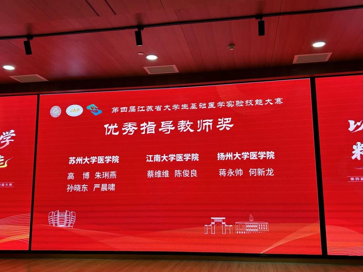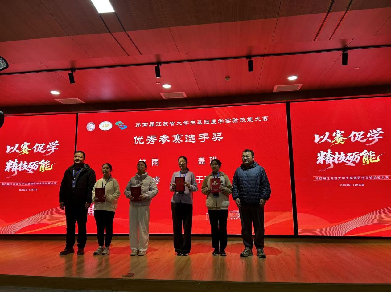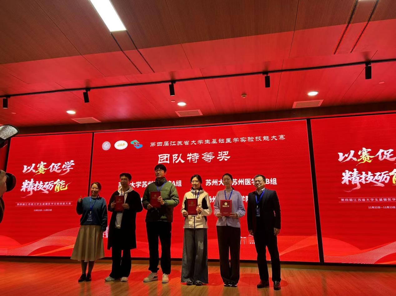 11月23日,第四届江苏省大学生基础医学实验技能大赛在苏州大学圆满落幕。经过激烈角逐,由我院实验教学中心选派的两支本科生代表队,在众多强劲对手中脱颖而出,最终斩获团队特等奖与团队一等奖各一项,创下参赛以来的最佳战绩。队员于天悦获评“优秀参赛选手”,指导老师蔡维维、陈俊良荣获“优秀指导教师”称号。