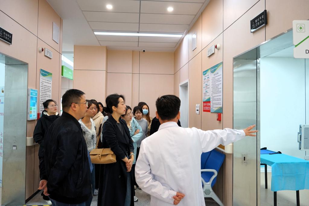 在翟华明主任的带领下,学院师生先后参观了中心全科诊疗区、检验科、B超室、预防保健科、居民健康体检与管理中心、中医馆、口腔科、康复科等重点科室,实地了解基层医疗卫生服务的运行模式、服务内容与工作场景。翟华明主任详细介绍了中心的发展历程、科室设置、特色服务以及当前人才队伍建设的现状,并围绕基层医疗卫生机构的人才需求、岗位设置和职业发展路径等问题进行了重点说明,让在场师生直观感受到基层卫生岗位对专业人才的迫切需求与广阔平台。