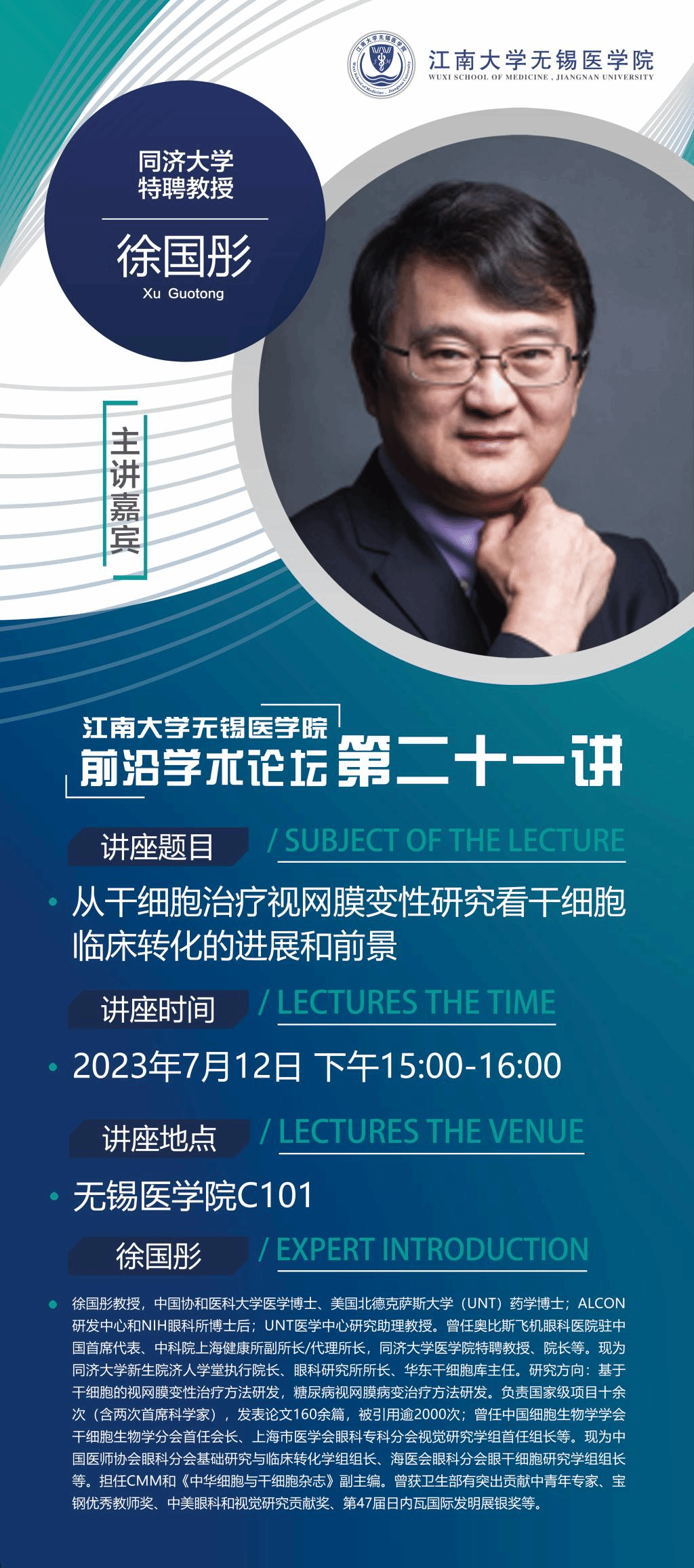 7月12日p站 前沿学术论坛第二十一讲 徐国彤教授——从干细胞治疗视网膜变性研究看干细胞临床转化的进展和前景