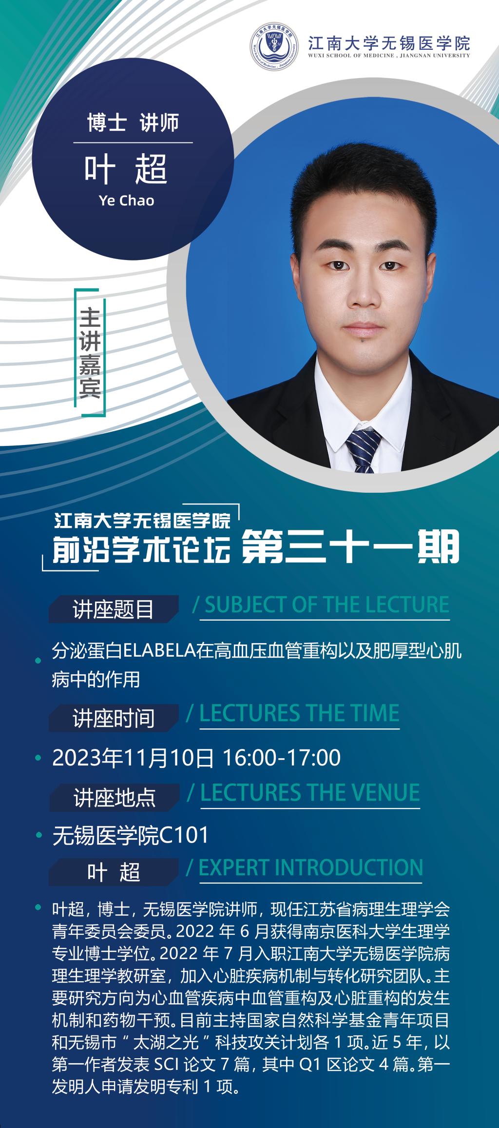 11月10日p站 前沿学术论坛第三十一讲 叶超老师——分泌蛋白ELABELA在高血压血管重构以及肥厚型心肌病中的作用