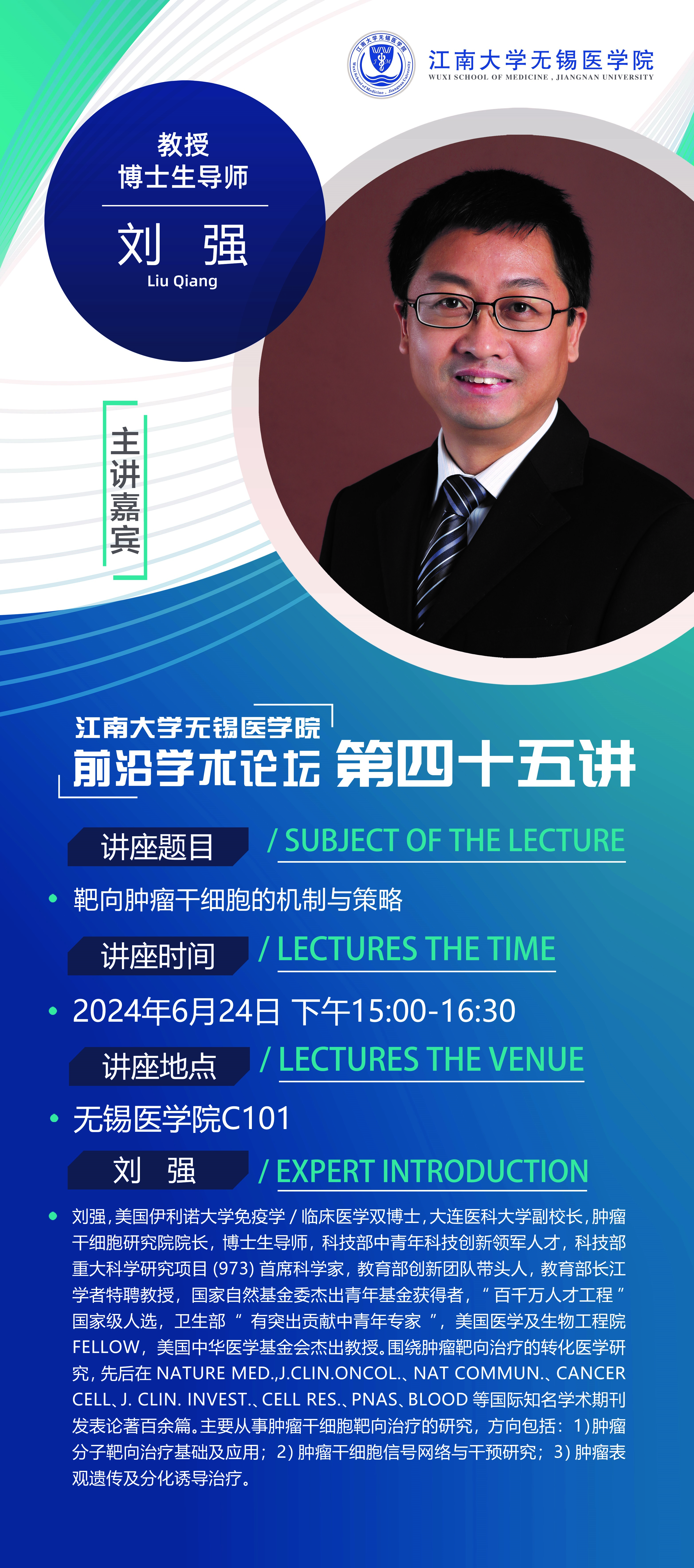 主讲嘉宾:刘强 美国伊利诺大学免疫学/临床医学双博士,大连医科大学副校长,肿瘤干细胞研究院院长