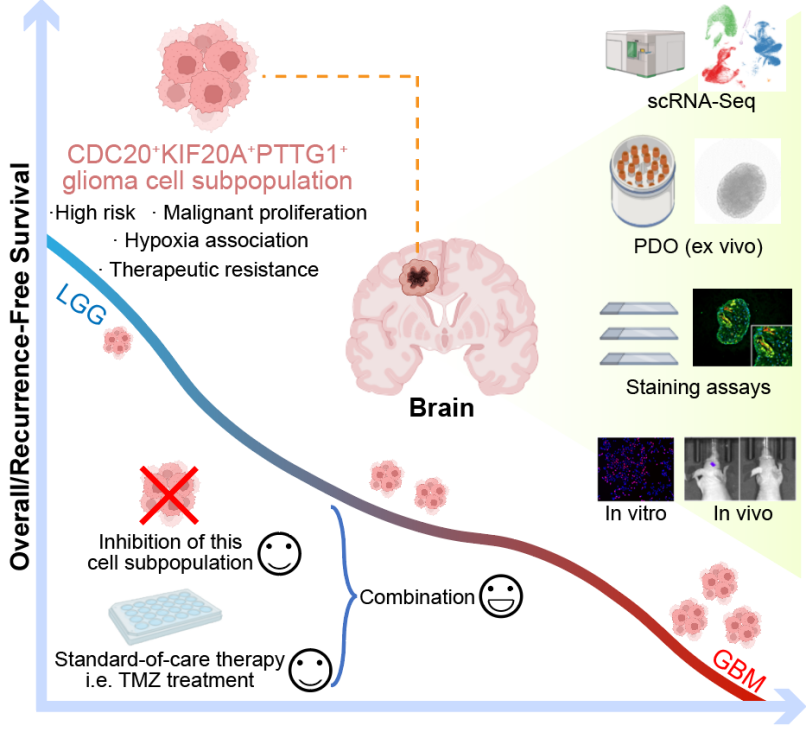 在读博士生万权为论文共一第一作者)。该研究揭示了一种在胶质瘤进展中可能起关键作用的新型低氧高风险胶质瘤细胞亚群,该亚群还可能抵抗胶质瘤标准治疗从而导致疾病复发。该研究为针对胶质瘤进展的治疗策略提供了新的见解,解析并精准抑制特定细胞亚群来增强现有标准治疗效力,从而减缓甚至阻止早期胶质瘤发展为晚期疾病可能是一种有前景的治疗方案。