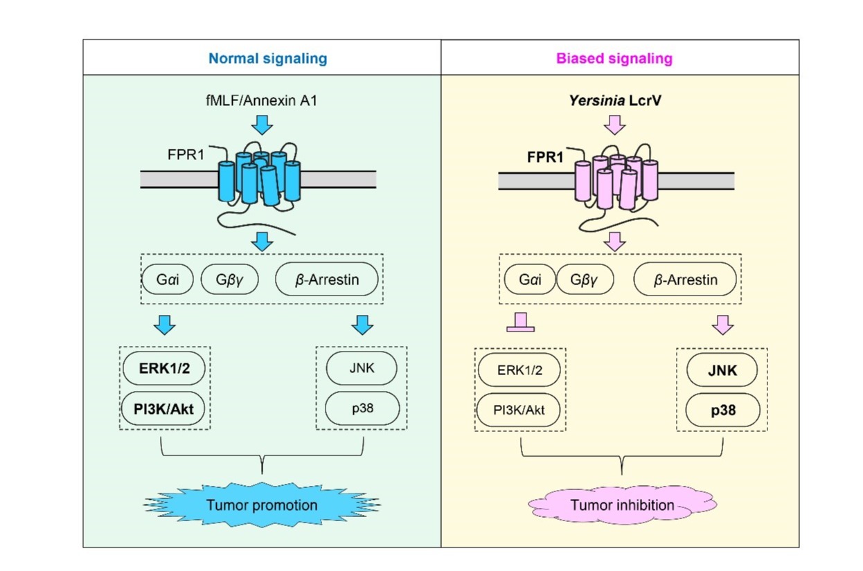 吴国胜/葛运军团队和香港中文大学(深圳)叶德全团队在《Acta Pharmaceutica Sinica B》(IF=14.7)发表了题为“Discovery ofYersiniaLcrV as a novel biased agonist of formyl peptide receptor 1 to bi-directionally modulate intracellular kinases in triple negative breast cancer”的研究性论文。葛运军博士等关注TNBC细胞上表达的一种GPCR-甲酰肽受体1(FPR1),发现耶尔森菌的LcrV蛋白能偏向激动FPR1并调控肿瘤细胞表型。此前研究报道LcrV蛋白是FPR1的一种结合蛋白,引导耶尔森菌攻击人体表达FPR1的免疫细胞,与鼠疫发生有关(Nature 2019)。本研究进一步发现LcrV蛋白可诱导FPR1及其下游G蛋白的特殊活化构象,偏向激动FPR1下游信号。通过偏向激动TNBC细胞上FPR1,LcrV蛋白引起肿瘤细胞内ERK和JNK激酶活性的双向变化,选择性增加受体介导的抗肿瘤信号而减少其促肿瘤信号,发挥常规激动剂或拮抗剂所不具备的双重抗肿瘤作用。