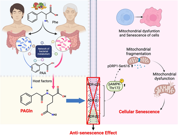 在《Nature Aging》发表了题为“Gut microbial-derived phenylacetylglutamine accelerates host cellular senescence“的研究论文。该研究发现肠道菌群来源代谢物苯乙酸(PAA)及次级代谢物苯乙酰谷氨酰胺(PAGln)在宿主血浆中随着年龄的增长而增加;PAGln通过肾上腺素受体-AMPK信号轴影响线粒体动力学紊乱,促进细胞衰老;PAGln诱导的体内外细胞衰老可以通过肾上腺素能受体阻断和体内衰老细胞裂解法治疗来改善。该研究系统地揭示了衰老相关的肠道微生物变化加速细胞衰老的机制之一。该研究深入地解析了微生物和宿主共代谢物PAGln随着年龄的增长而增加的原因,并通过何种机制影响宿主细胞。该研究还进一步验证了阻断肾上腺素能受体以及衰老细胞裂解疗法在延缓PAGln诱导的宿主细胞衰老上的可行性,为对抗衰老提供了新的思路和解决策略。
