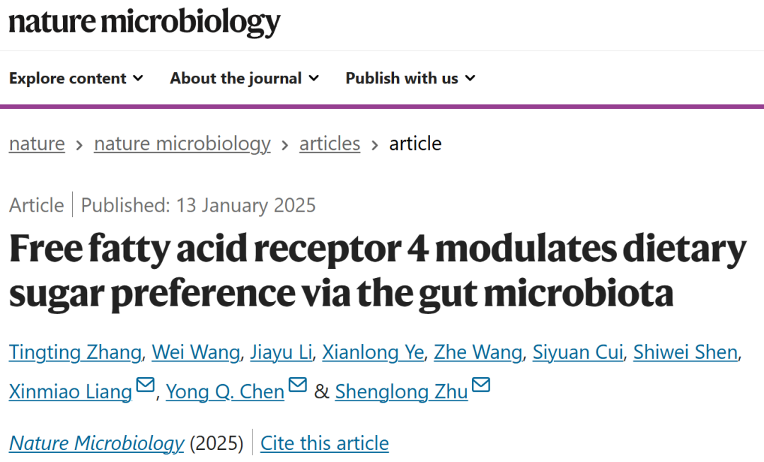 陈永泉与朱升龙课题组在《Nature Microbiology》(IF:20.5)发表重要研究成果:Free fatty acid receptor 4 modulates dietary sugar preference via the gut microbiota。,阐明了游离脂肪酸受体4(Ffar4)通过肠道菌群调控糖类偏好的分子机制。