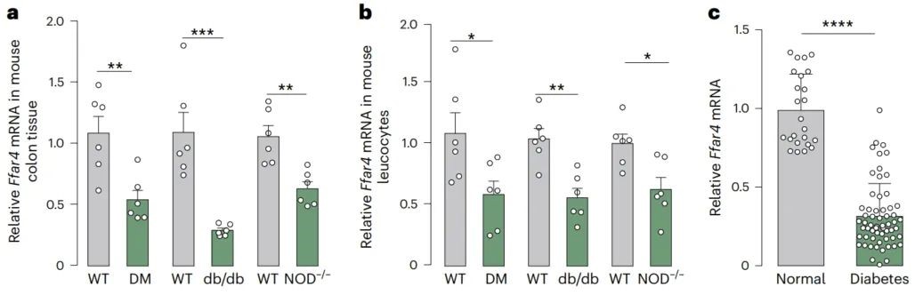 研究通过检测18只糖尿病模型小鼠和60例2型糖尿病患者的血液样本,并与24例健康人群对照比较,发现实验组的Ffar4的mRNA表达量明显下降。进一步在三种不同糖尿病动物模型中也证实,小鼠体内的Ffar4基因表达水平呈现显著下调趋势。这一结果表明Ffar4的表达异常可能与糖尿病发病机制存在关联。