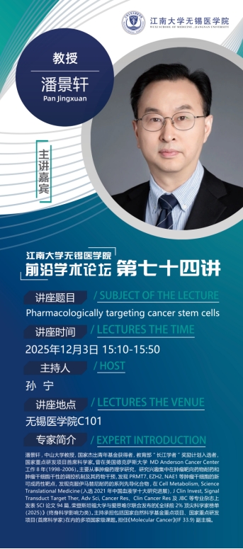嘉宾简介:潘景轩, 中山大学教授,国家级人才计划入选者,国家重点研发项目首席科学家。曾在美国德克萨斯大学MD Anderson Cancer Center工作8年(1998-2006)。主要从事肿瘤药理学研究,研究兴趣集中在肿瘤靶向药物耐药和肿瘤干细胞干性的调控机制及其药物干预,发现PRMT7、EZH2、NAE1等肿瘤干细胞的新可成药性靶点,发现克服伊马替尼耐药的系列先导化合物,在Cell Metabolism, Science Translational Medicine(入选2021年中国血液学十大研究进展), J Clin Invest, Signal Transduct Target Ther, Adv Sci, Cancer Res、Clin Cancer Res等专业杂志上发表SCI论文94篇,荣登斯坦福大学与爱思唯尔联合发布的《全球前2%顶尖科学家榜单(2025)》(终身科学影响力类)。主持承担包括国家自然科学基金重点项目、国家重点研发项目(首席科学家)在内的多项国家级课题。担任《Molecular Cancer》(IF 33.9) 副主编。