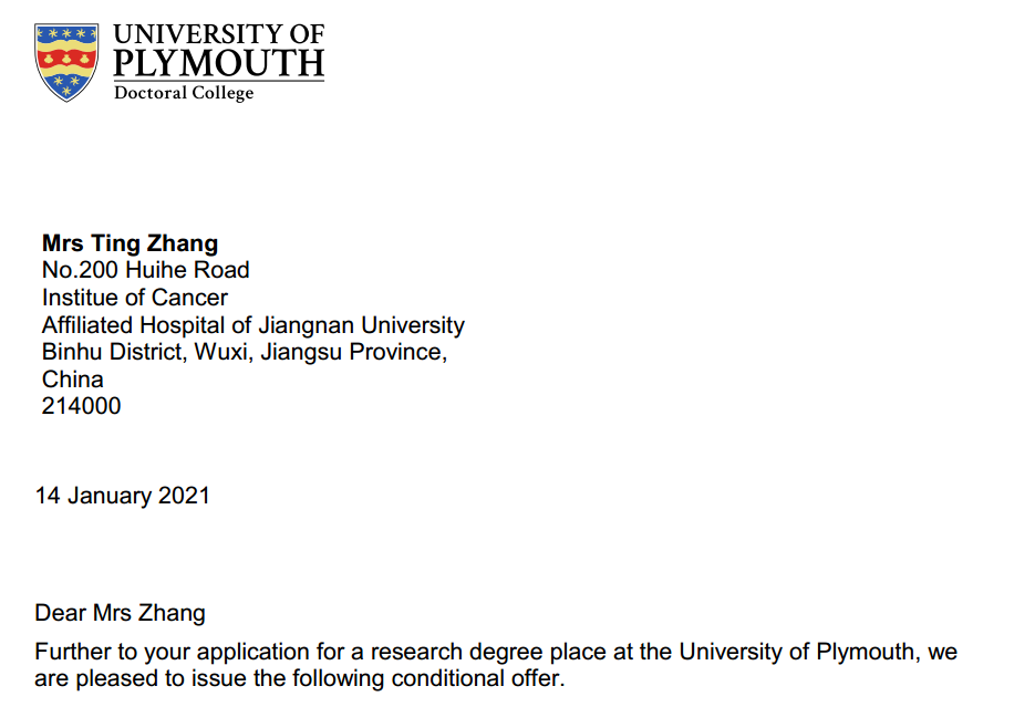 与英国普利茅斯大学医疗与健康学院联合培养生物医学博士研究生项目进展顺利。经过前期报名申请、委员会审核、考试与面试等申请流程,最终我校附属医院心内科杨瑞晨和肿瘤研究所张婷两名职工成为该项目第一批培养对象,顺利被英国普利茅斯大学正式录取,即将攻读生物医学博士研究生。