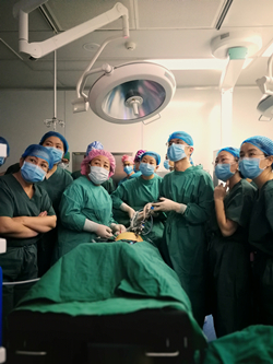 妇科许希中主任医师(右三)指导当地医生开展首例腹腔镜下子宫肌瘤剥除术