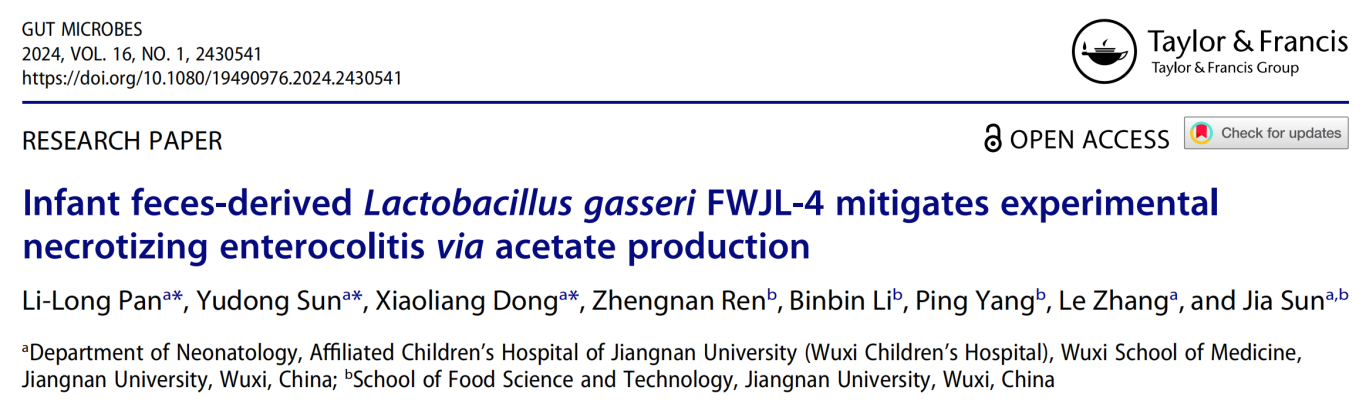 近年来,益生菌在NEC预防与治疗中的潜力备受关注。本研究聚焦于新型益生菌格氏乳杆菌(Lactobacillus gasseri,L. gasseri)FWJL-4,该菌株源自健康婴儿粪便,具有抗炎及抗氧化应激特性。章乐课题组的最新研究证实,L. gasseri FWJL-4通过其代谢产物乙酸(一种短链脂肪酸),以依赖GPR43和GPR41的方式抑制回肠程序性坏死,维持肠道吸收细胞和杯状细胞的数量,显著增强肠道屏障,改善实验性NEC小鼠的症状。这一发现为NEC的干预策略提供了新方向,并为肠道微生物的研究提供新的菌株资源。