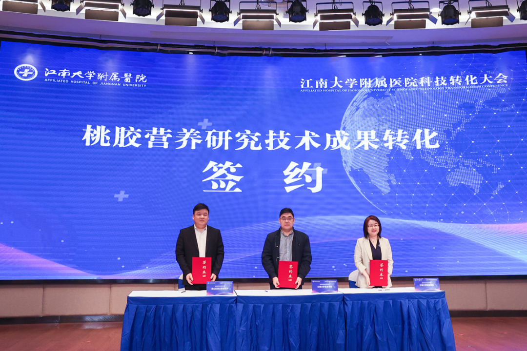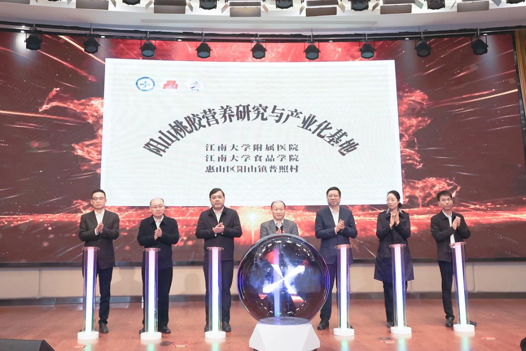 附属医院党委书记过栋,惠山区委常委、组织部部长吴波,阳山生态休闲旅游度假区党工委书记、管理办公室主任、阳山镇党委书记许彤亮共同为“桃胶营养研究与产业化基地”揭牌。