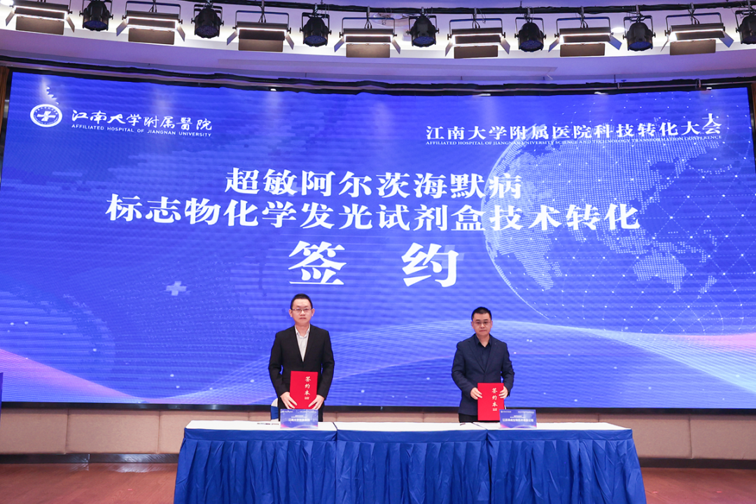 附属医院韩霜,江苏泽成生物技术有限公司副总经理夏振伟进行超敏阿尔茨海默病标志物化学发光试剂盒技术转化签约。
